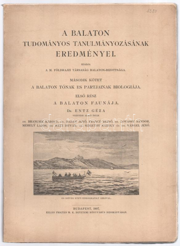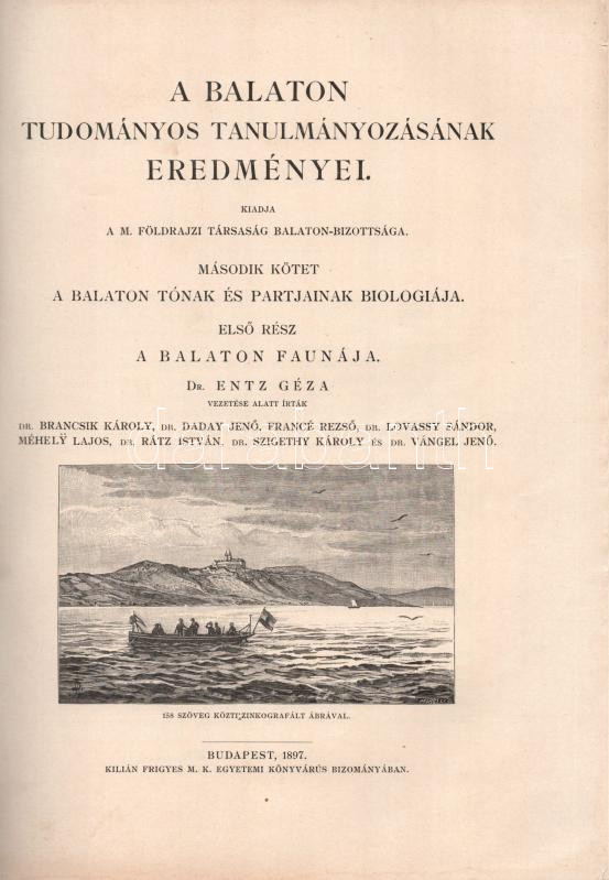 A Balaton faunája. Entz Géza vezetése alatt írták: Brancsik Károly, Daday Jenő, Francé Rezső, Lovassy Sándor, Méhely Lajos, Rátz István, Szigethy Károly, Vángel Jenő. A Balaton tudományos tanulmányozásának eredményei II. köt.: A Balaton tónak és parjainak biologiája. I. rész. Bp., 1897, Magyar Földrajzi Társaság Balaton-Bizottsága,(Kilián Frigyes-ny.), XXXIV+2+252 p. Kiadói papírkötés, nagyrészt felvágatlan lapokkal. Ritka!