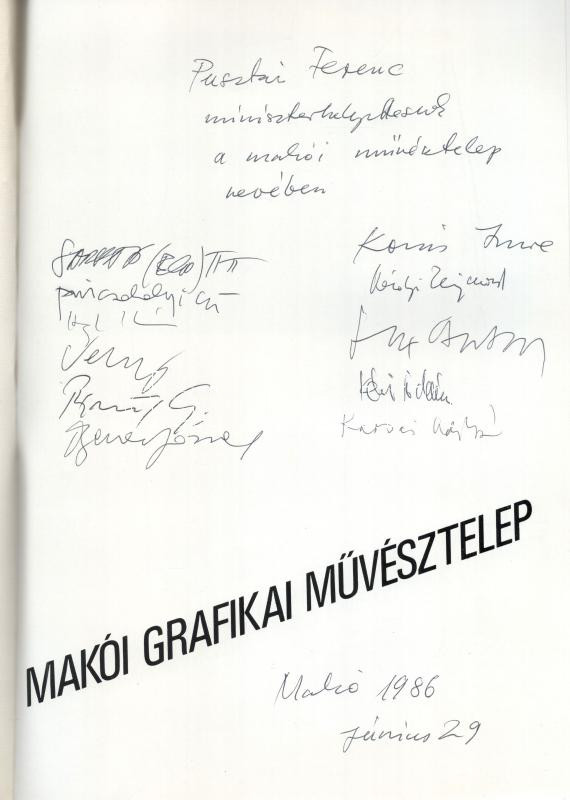 Kocsis Imre (szerk.): Makói Grafikai Művésztelep. Makó 1984, 1985. Kocsis Imre (1940-2015) által Pusztai Ferenc miniszterhelyettes részére dedikált és számos művész által aláírt: Sarkadi Péter (1948-), Pinczehelyi Sándor (1945-), Veszely Ferenc (1945-), Pásztor Gábor (1933-2012), Benes József (1938-2017), Károlyi Zsigmond (1952-), Lux Antal (1935-), Kéri Ádám (1944-), Karsai Ildikó (1954-) égy további beazonosítandó aláírással. Makó, (1986), József Attila Művelődési Központ. Fekete-fehér képekkel, a fent megnevezett művészeken kívül Bak Imre, Bukta Imre, Gaál József, Szirtes János, Tolvay Ernő és mások grafikáinak reprodukcióival illusztrált katalógus. Kiadói papírkötés, kissé foltos borítóval.