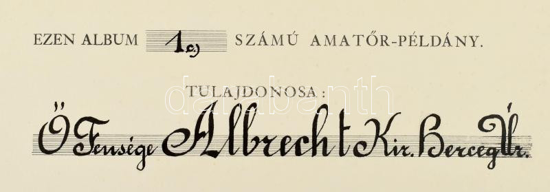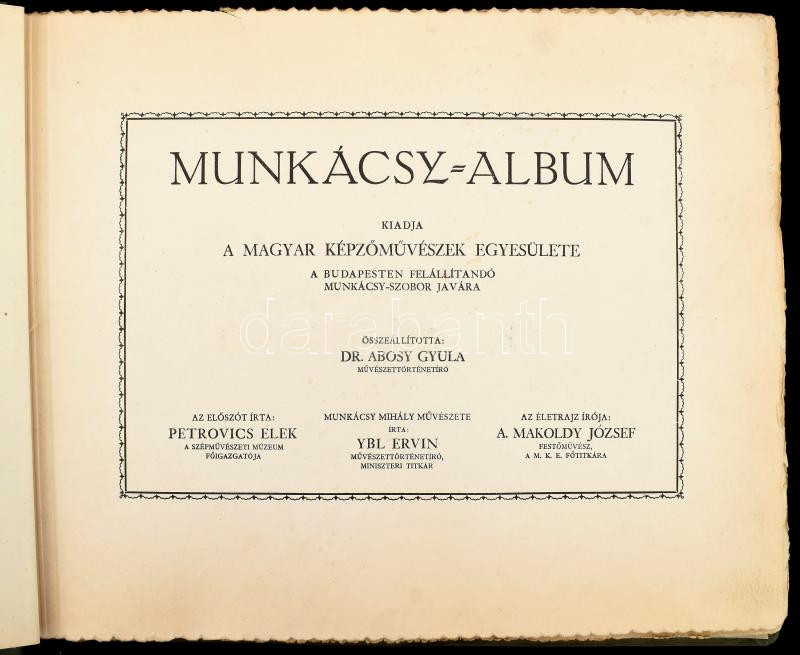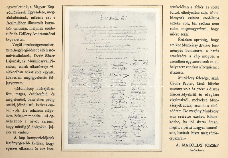 Munkácsy-album 1. sorszám Albrecht királyi herceg nevére szóló, sorszámozott. Kiadja a Magyar Képzőművészek Egyesülete a Budapesten felállítandó Munkácsy szobor javára. Előszó: Petrovics Elek. Életrajz: Á. Makoldy József. Összeáll. Abosy Gyula. : (Bp., 1927, Hornyánszky.) 4 lev., 11 t., 11 lev. Kiadói, zsinórfűzésű, vászon borítású, haránt alakú, albumban. Kissé kopott egészvászon kötésben