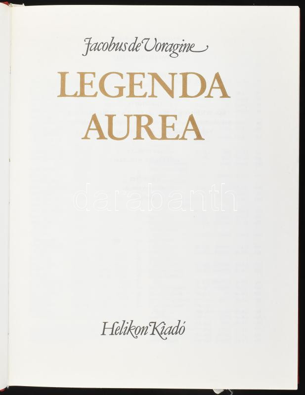 Voragine, Jacobus de: Legenda Aurea. Vál.,. az előszót, a jegyzeteket és a mutatókat Madas Edit készítette. A képeket Wehli Tünde válogatta. Fordította Bárczi Ildikó, Déri Balázs et alii. Bp.,1990, Helikon,(Békéscsaba,Kner-ny.),333+3 p. Bibliofil kiadás. A könyvterve Szántó Tibor munkája. Kiadói selyem-kötés, kiadói papírtokban, szép állapotban. Megjelent 2000 példányban.