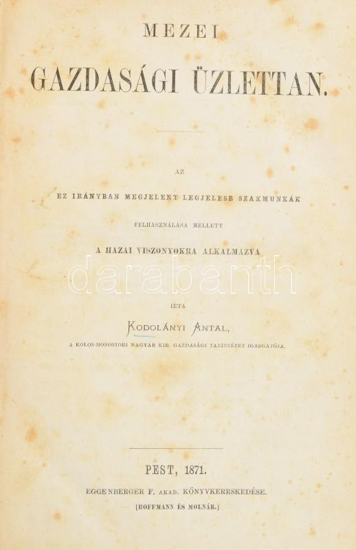 Kodolányi Antal: Mezei gazdasági üzlettan. Az ez irányban megjelent legjelesb szakmunkák felhasználása mellett a hazai viszonyokra alkalmazva. Pest, 1871, Eggenberger F.,(Hoffmann és Molnár), (Pozsony, Wigand K. F. -ny.), IV+4+462+10 p. Korabeli átkötött félvászon-kötés, kissé kopott borítóval és gerinccel, foltos lapokkal. Ritka!