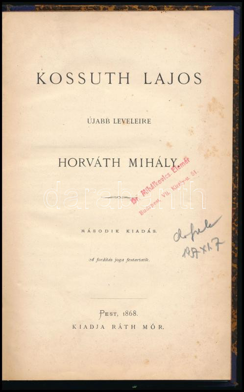 Description: Horváth Mihály: Kossuth Lajos újabb leveleire. Pest, 1868, Ráth Mór (Bécs, Holzhausen Adolf-ny.), 131 p. Második kiadás. Átkötött félvászon-kötésben, minimálisan sérült borítóval, néhány kissé foltos lappal, tulajdonosi bélyegzővel (Dr. Mihálkovics Elemér).