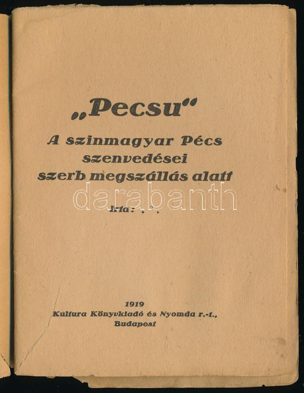 "Pecsu." Egy színmagyar város szenvedései szerb megszállás a... https://www.darabanth.com/en/43-Major-auction/43.1/Books/Books-History~17593/Pecsu-Egy-szinmagyar-varos-szenvedesei-szerb-megszallas-alatt-Bp-1919-Kultura-Konyvkia~II3203796