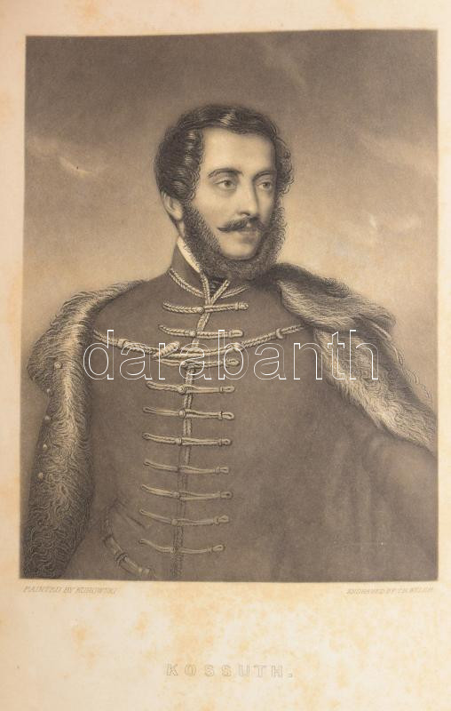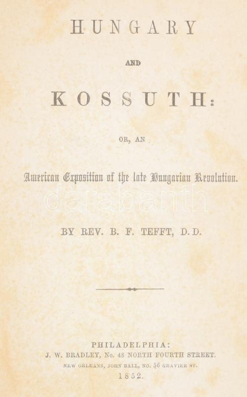 Tefft, B[enjamin] F[ranklin]: Hungary and Kossuth: or, an American Exposition of the late Hungarian Revolution. Philadelphia - New Orleans, 1852, J. W. Bradley - John Ball, (Philadelphia, Smith & Peters - ny.), 1 (Kossuth Lajos acélmetszetű portréja, hártyapapírral,) t.+378 p. Angol nyelven. Korabeli aranyozott egészvászon-kötés, mintás lapélekkel, kopott borítóval, a gerincen kis sérüléssel, kissé foxing foltos lapokkal, régi AKV-s aukciós címkével.