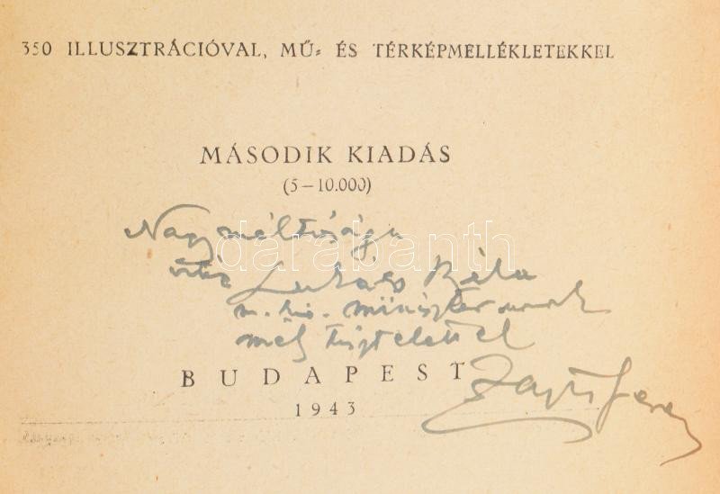 Zajti Ferenc: Magyar évezredek. (Skytha-hun-magyar faji azonosság.) 350 illusztrációval, mű és térképmellékletekkel. A szerző, Zajti Ferenc (1886-1961) festő, autodidakta orientalista, egyetemi tanár, könyvtáros, író által vitéz Lukács Béla (1892?1958) politikus, főispán, államtitkár, a Kállay-kormány tárca nélküli hadigondozási minisztere részére DEDIKÁLT példány! Bp., 1943., Móricz Zsigmond Könyvkiadóvállalat, ("Pátria"-ny.), XII+443 p.+34 (fekete-fehér képtáblák, 8 kihatjható) t. Fekete-fehér képekkel gazdagon illusztrált. 2. kiadás. Kiadói félvászon-kötés, kopott, foltos borítóval, a gerincen sérülésnyommal. A mű szerepel az Ideiglenes Nemzeti Kormány által 1945-ben kiadott, tiltott könyvek listáján.
