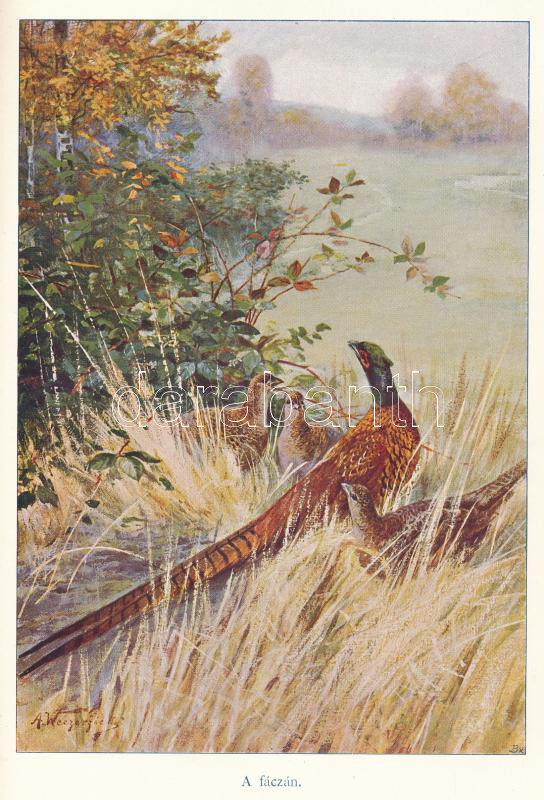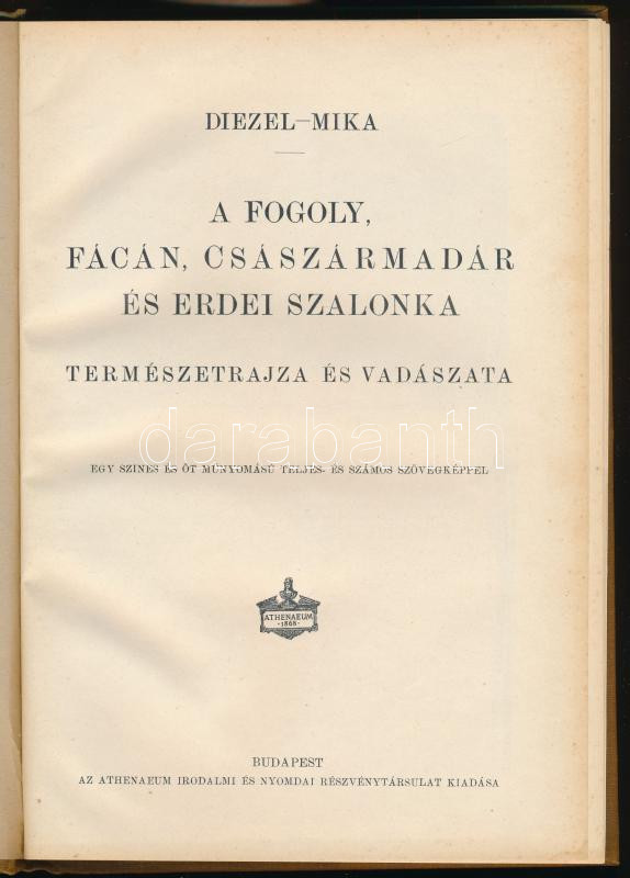 Diezel, [Karl Emil] - Mika, [Károly]: A fogoly, fácán, császármadár és erdei szalonka természetrajza és vadászata. Egy színes és öt münyomású teljes- és számos szövegképpel. Bp., [1912], Athenaeum, 4+128 p. + 6 (egészoldalas képtáblák, közte színes) t. Szövegközti képekkel gazdagon illusztrált. Kiadói festett egészvászon-kötésben, a borítón kis kopásnyomokkal, de alapvetően szép állapotban.