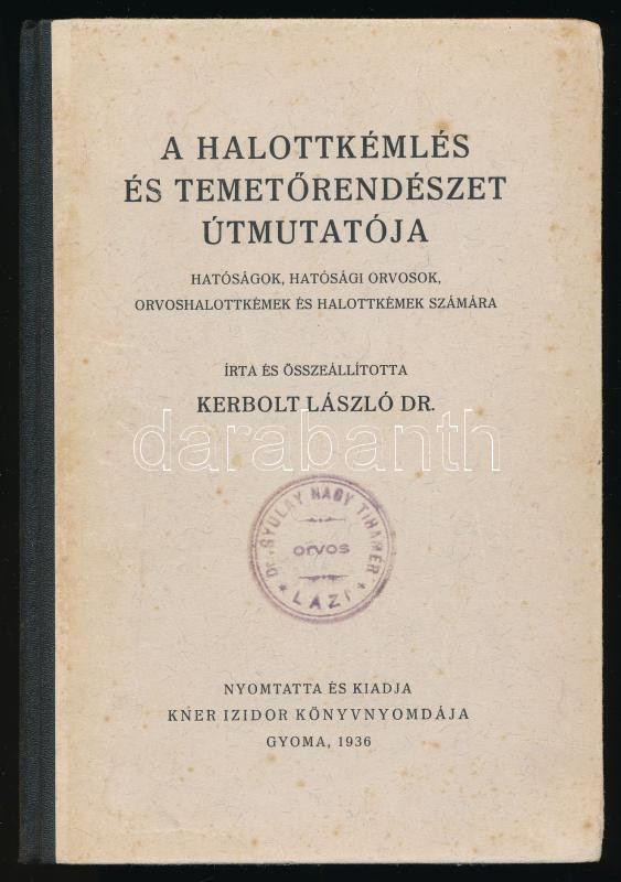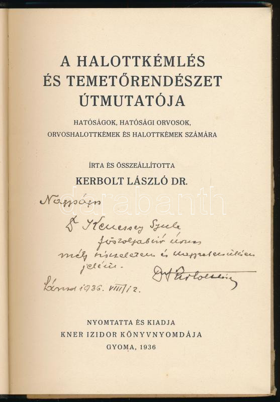 Kerbolt László: A halottkémlelés és temetőrendészet útmutatója. Hatóságok, hatósági orvosok orvoshalottkémek és halottkémek számára. Írta és összeáll. - - Dr. A szerző, Dr. Kerbolt László (?-?) által Dr. Kenessey Gyula főszolgabíró részére DEDIKÁLT példány. "Nagyságos Dr. Kenessey Gyula főszolgabíró úrnak mély tiszteletem és nagyrabecsülésem jeléül. Sárosd, 1936. VIII. 12. Gyoma, 1936, Kner Izidor, 94+1 p. Kiadói félvászon-kötés, kissé kopott, kissé foltos borítóval, aláhúzásokkal,"Gyulay Nagy Tihamér" orvos névbélyegzéseivel. Dr. Kenessey Gyula (1888-1945) jogi doktor, 69-es gyalogezred katonája az I. világháborúban, a Magyar Tűzharcos Szövetség alelnöke, sárbogárdi főszolgabíró (1926-1944.) A fejérmegyei közélet ismert és tisztelt alakja volt. Határozottan lépett fel a nyilas mozgalom ellen, ezért Szálasi utasítására letartóztatták és Dachauba szállították, ahol végül elhunyt.