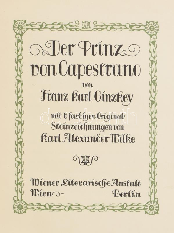 Description: Ginzkey, Franz Karl: Der Prinz von Capestrano. Mit 6 farbigen Original-Steinzeichnungen von Karl Alexander Wilke. Wien-Berlin,[1921.],Wiener Literarische Anstalt, 79+1 p.+ 6 t. Német nyelven. Kiadói aranyozott félbőr-kötés, kissé kopott borítóval, javított gerinccel. Számozott (283./300), a szerző és az illusztrátor által ALÁÍRT példány!
