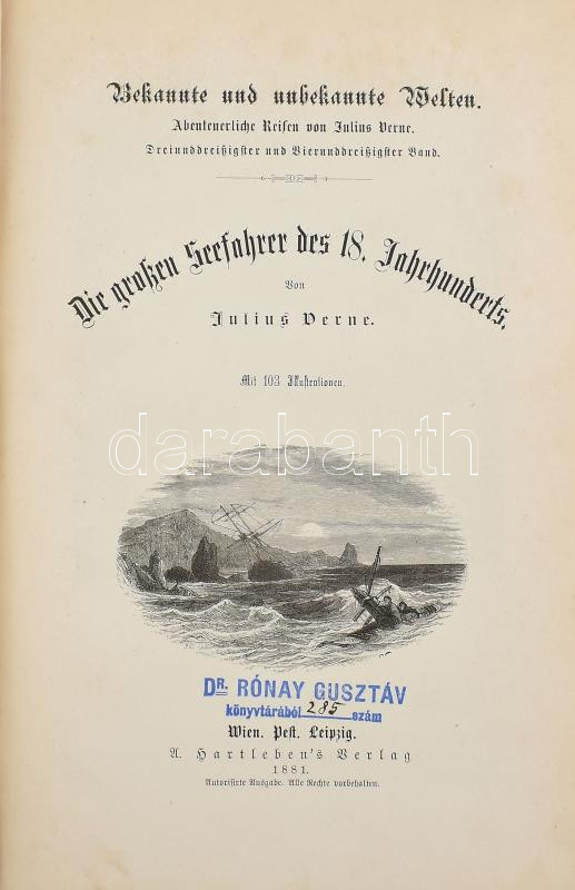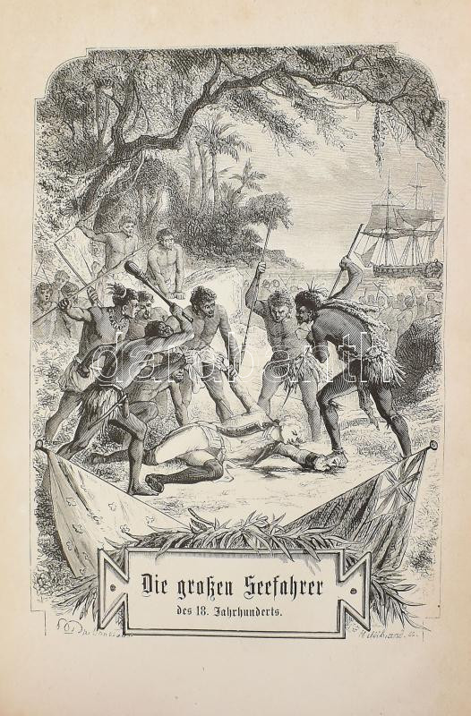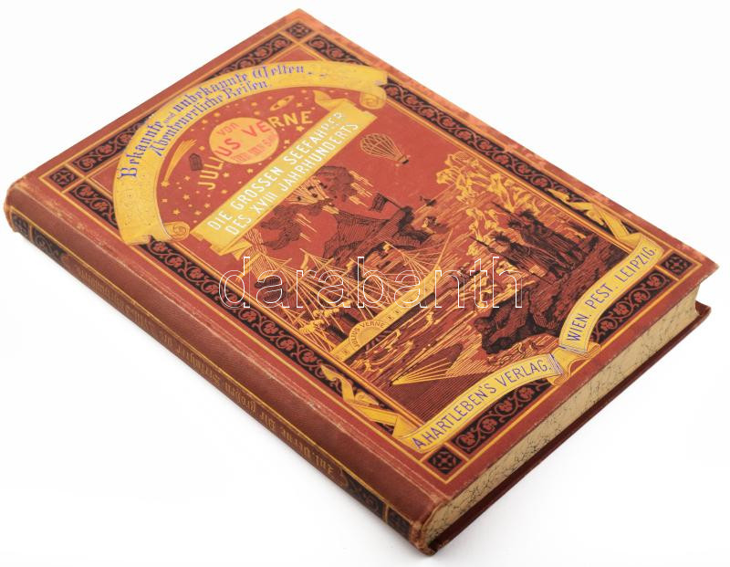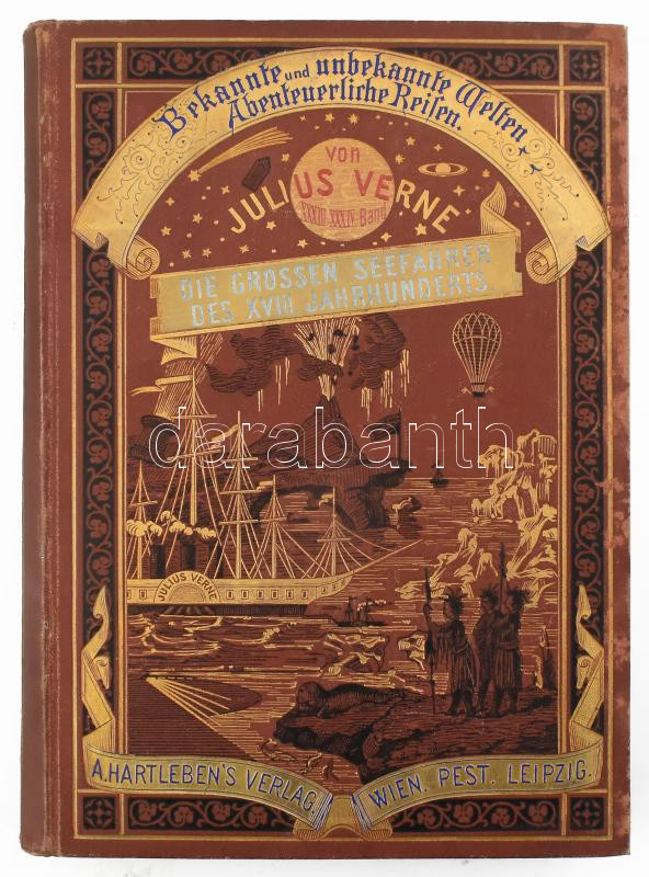 Julius Verne: Die großen Seeharer des 18. Jahrhunderts. [ A XVIII. század híres hajósai.] Bekannte und unbekannte Welten. Abenteuerliche Reisen von Julius Verne Band XXXIII-XXXIV. Wien - Pest - Leipzig, 1881., A Hartleben's Verlag, (Wien, Friedrich Jasper - ny.), 520 p. Német nyelven. Rendkívül gazdag fametszetű képanyaggal illusztrált. Kiadói dúsan aranyozott, festett, illusztrált egészvászon-kötés, márványozott lapélekkel, kopott, foltos borítóval, magángyűjteményi bélyegzéssel. Ritka!