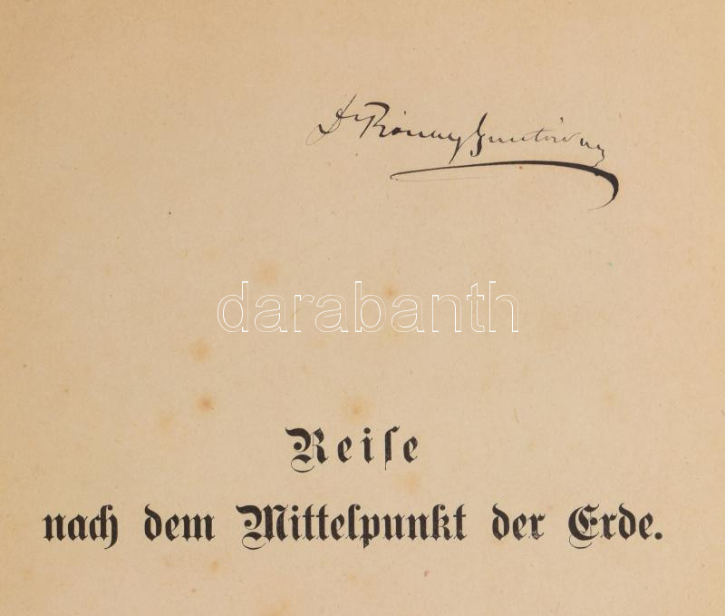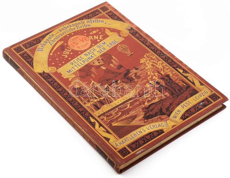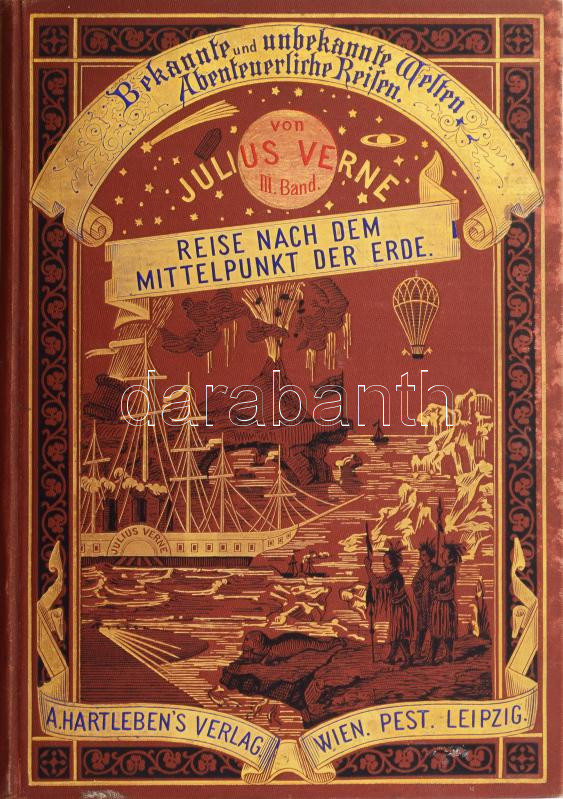 Julius Verne: Reise nach dem Mittelpunkt der Erde. [Utazás a Föld középpontja felé.] Bekannte und unbekannte Welten. Abenteuerliche Reisen von Julius Verne Band III. Wien - Pest - Leipzig, 1874., A. Hartleben,(Grimme & Trömel-ny.), 246 p. Német nyelven. Rendkívül gazdag fametszetű képanyaggal illusztrált. Kiadói dúsan aranyozott, festett, illusztrált egészvászon-kötés, márványozott lapélekkel, kopott, kissé foltos borítóval, az első fejezet (Erster Kapitel) előtt egy lap hiánnyal, de maga a szöveg teljes (illusztráció?, üres lap?), egy lapon javítással, magángyűjteményi bélyegzéssel. Ritka!
