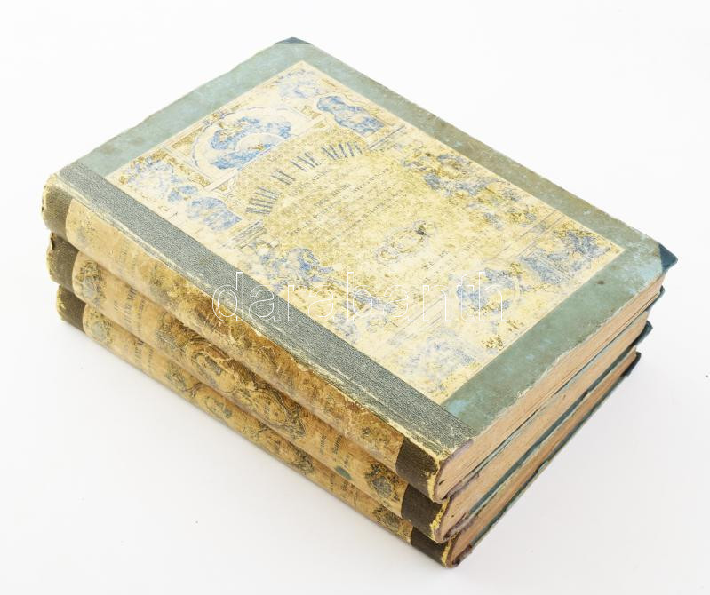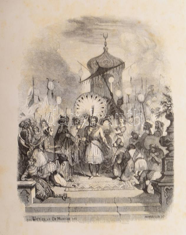 Les Mille et une Nuits. Contes arabes. Traduits par [Antoine] Galland. Edition illustrée par les meilleurs artistes français et étrangers. Revue et corrigée sur l'édition princeps de 1704, augmentée d'une Dissertation sur les Mille et une Nuits par M. le Baron Silvestre de Sacy. Paris, 1840, Ernest Bourdin et C., 2 p.+ 1 (címkép) t.+1 (díszcímlap) t+2+VIII+482 p.+5 t.; 2 p. + (díszcímlap) t. +2+576 p.+7 t.; 2 p. + (díszcímlap) t. +2+482 p.+ t. Francia nyelven. Rendkívül gazdag fametszetű képanyaggal illusztrált, közte erotikus illusztrációkkal is. Félvászon-kötésben, a borítókon és a gerinceken az eredeti papírborítókkal, kopott borítókkal, foltos lapokkal.