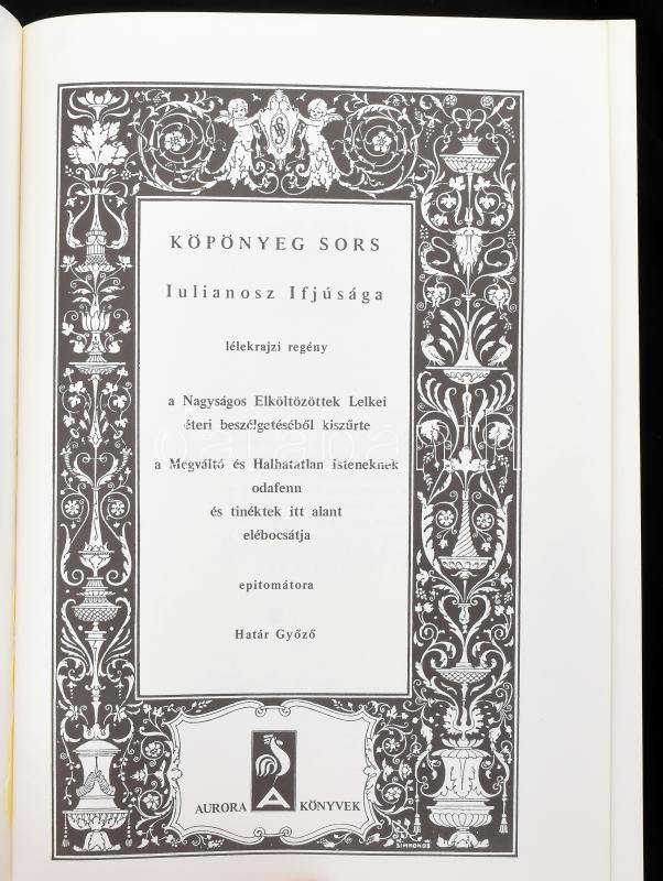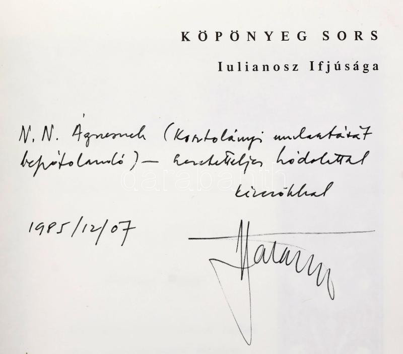 Határ Győző: Köpönyeg sors. Iulianosz ifjúsága. Lélekrajzi regény. A Nagyságos Elköltözöttek Lelkei éteri beszélgetésből kiszűrte, a Megváltó és halhatatlan isteneknek odafenn és tinéktek itt alant elébocsátja epitomátora - -. A szerző, Határ Győző (1914-2006) Kossuth-díjas magyar író, költő, műfordító, filozófus, építész által N[emes] N[agy] Ágnes (1922-1991) Kossuth-díjas magyar költő, műfordító, esszéíró részére DEDIKÁLT példány. "N. N. Ágnesnek (Kosztolányi mulasztását bepótolandó) - szeretetteljes hódolattal kézcsókkal. 1985/12/07." London, 1985, Aurora, 621 p. Emigráns kiadás. Kiadói papírkötés, a gerincen szakadással.