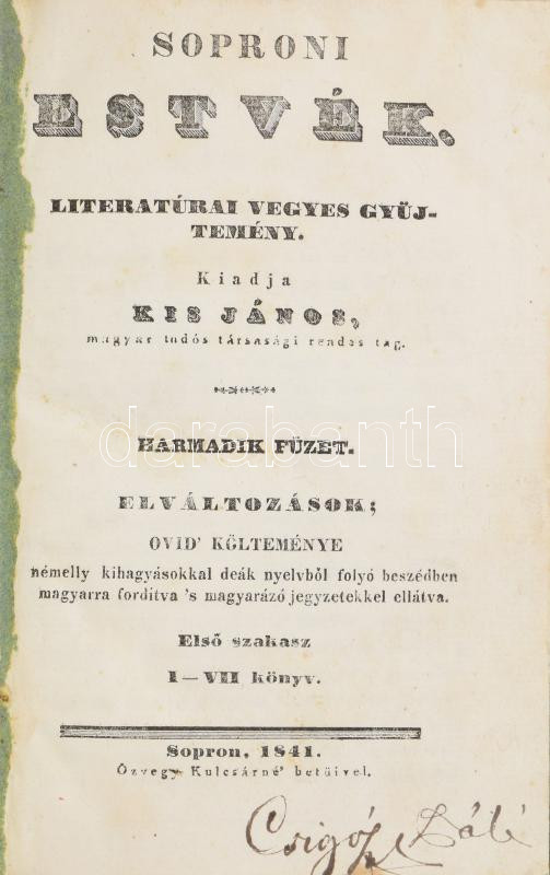 Kis János: Soproni Estvék. III. füzet. Literatúrai vegyes gyűjtemény. Kiadja Kis János. Sopron, 1841, Özvegy Kulcsárné' betűivel, 4+293 [helyesen 292] p. Korabeli egészvászon-kötésben, kopott, foltos borítóval, névbejegyzéssel. Ritka! Kis János (1770-1846) evangélikus lelkész, a Dunántúli evangélikus egyházkerület szuperintendense (azaz püspöke) 1812-től haláláig, költő, műfordító. Korának egyik érdekes, rendkívül sokoldalú alakja volt. Költői és műfordítói tevékenysége mellett sokat tett az irodalmi élet fejlesztéséért: a Soproni Magyar Társaság alapítója, az Akadémia tagja és számos ismeretterjesztő mű kiadója is volt. Berzsenyi felfedezőjeként is emlegetik. E munkájában saját verseit és fordításait adta közre. 1841-ben két füzete is napvilágot látott, 1842-43-ban nem jelent meg.
