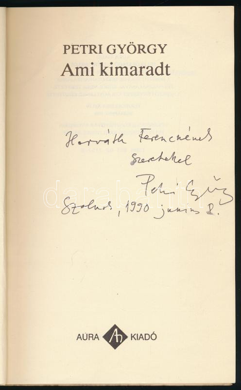 Description: Petri György: Ami kimaradt. A szerző, Petri György (1943-2000) Kossuth- és József Attila-díjas költő, műfordító, újságíró által DEDIKÁLT példány! [Bp.], 1989, Aura Kiadó, 128 p. Első kiadás. Kiadói papírkötés.