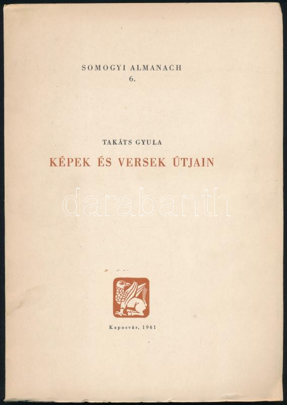 Takáts Gyula: Képek és versek útjain. Somogyi Almanach 6. A szerző, Takáts Gyula (1911-2008) Kossuth-díjas költő, író, műfordító, kritikus, múzeumigazgató által Szíjártó Árpád somogyi költő, belgyógyász, főorvos, Takáts Gyula tanítványa részére DEDIKÁLT példány. Kaposvár, 1961, Somogy Megyei Tanács VB Művelődési Osztálya, (Somogy m. Nyomdaipari Vállalat-ny.), 1 (EgryJózsef: Takáts Gyula portréja) t.+70+1 p. Kiadói papírkötés.; + Takáts Gyula tanítványai körében az 50 éves találkozón, fotó, rajta Fodor András költő, Szíjártó Árpád belgyógyász, főorvos és mások, 10x15 cm.; + Takáts Gyuláné Szabó Ilona (1909-1977) Takáts Gyula költő feleségének portréfotója, a hátoldalán Takáts Gyula DEDIKÁCIÓJÁVAL, 14x9 cm.; 1977 Takáts Gyula versei, újságkivágáson.
