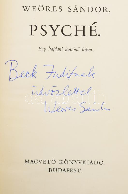 Weöres Sándor: Psyché. A szerző, Weöres Sándor (1913-1989) költő által Beck Judit (1909-1995) festőművész, grafikus részére DEDIKÁLT példány. Egy hajdani költőnő írásai. Gyulai Líviusz rajzaival. Bp.,1972, Magvető, 294+2 p. Első kiadás. Kiadói egészvászon-kötés, szakadt kiadói papír védőborítóban, ex libris-szel: Ex libris Beck Judit, klisé, papír, jelzett (BJ.), 8x5,5 cm. Beck Judit (1909-1995) festőművész, grafikus, keramikus, textil- és bábtervező, Beck Ö. Fülöp szobrász lánya, Radnóti Miklós szerelme, Gombosi György zenetörténész, majd Major Tamás színész felesége volt.