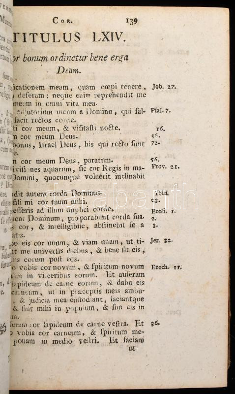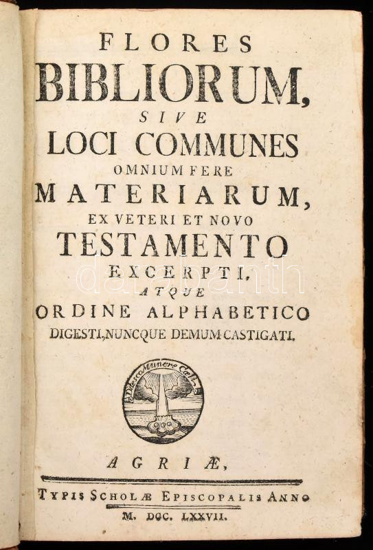 [Hibernicus, Thomas]: Flores bibliorum, sive loci communes omnium fere materiarum, ex veteri et novo testamento excerpti, atque ordine alphabetico digesti, nuncque demum castigati. Agriae [Eger], 1777, Typis Scholae Episcopalis, 693+(7) p. Latin nyelven. Korabeli, aranyozott gerincű félbőr-kötésben, kissé viseltes, sérült borítóval és gerinccel, helyenként sérült lapszélekkel, foltos lapokkal.