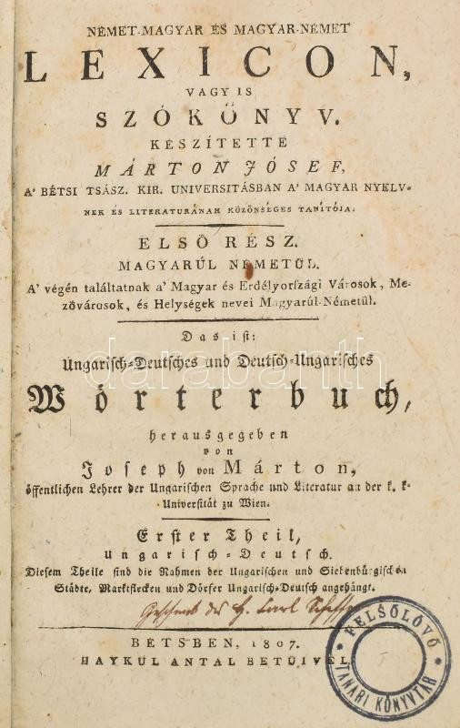 Márton Jó[z]sef: Német - magyar és magyar - német lexicon, vagy is szókönyv. Készítette: - -. Első rész: Magyarul és németül. Béts, 1807, Haykul Antal, 12+816 [kéthasábos számozás]+1+404 [kéthasábos számozás]+6 p. Magyar és német nyelven. Korabeli félbőr-kötés, kopott borítóval, kissé sérült gerinccel, régi intézményi bélyegzéssel.