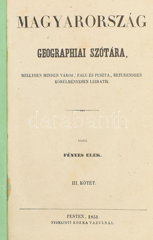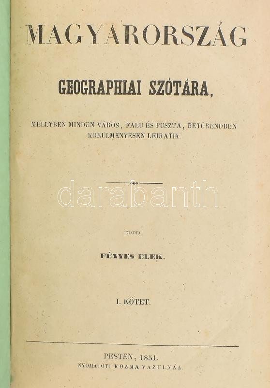 Fényes Elek: Magyarország geographiai szótára I-IV. köt. [Két kötetben.] Magyarország geographiai szótára, mellyben minden város, falu és puszta, betűrendben körülményesen leiratik. Pest, 1851, Kozma Vazul, 312+285+3 p.; 306+350 p. Első kiadás! A III. kötetben nyomdahibás számozással, (224. oldal után a 227.-es következik, de a szöveg folyamatos, nincs oldalhiány! Korabeli virágos-indás díszítésű egészvászon-kötés, kopott borítóval és gerinccel, néhol foxing foltokkal, de ezektől eltekintve belül jó állapotban.