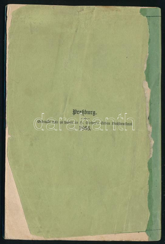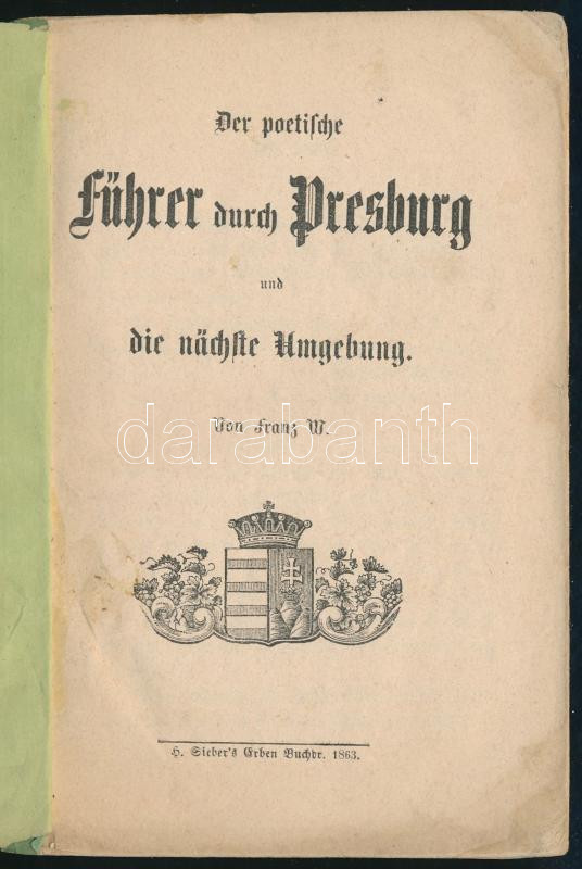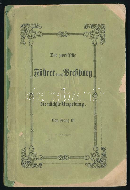 Franz W.: Der poetische Führer durch Presburg und die nächste Umgebung von - -. Preßburg [Pozsony/Bratislava], 1863, H. Siebers Erben,4+103 p. Német nyelven. Kiadói papírkötés, javított, sérült, kissé foltos, kopott borítóval, a címlap és az első lap sarkain kis hiánnyal, foltos lapélekkel. Ritka!