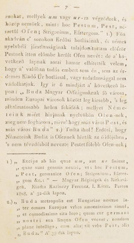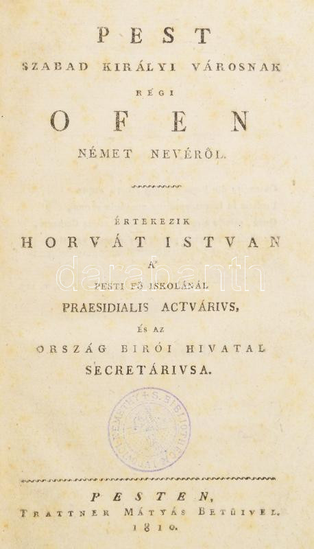 Horvát István: Pest szabad királyi városnak régi Ofen német nevéről. Értekezik Horvát István a' Pesti Fő Iskolánál praesidialis actuárius, és az ország birói hivatal secretáriusa. Pesten, 1810, Trattner Mátyás betűivel. 63p. A szerző Horvát István (1784-1846) történész, egyetemi tanár, nyelvész a kor egyik leg termékenyebb történetíró Révai Miklós tanítványa, Kazinczy pesti triászának tagja Több esetben bekapcsolódott a korszak történeti és nyelvészeti vitáiba. Része volt a Tudományos Gyűjtemény és az Auróra alapításában. 1815-ben az országos könyvtár (a későbbi OSZK) őrévé, 1823-ban a pesti egyetem oklevél-, nemzetség-, pecsét- és címertudomány tanárává nevezték ki. 1833-37-ig a Tudományos Gyűjtemény szerkesztője, 1837-43-ig a Nemzeti Múzeum igazgatója volt. Korabeli egészvászon kötésben , szép példány.