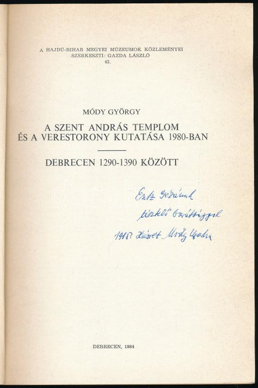Módy György: A Szent András templom és a Verestorony kutatása 1980-ban. Hajdú-Bihar Megyei Múzeumok Közleményei 42. szám. Debrecen, 1984. Entz Gézának DEDIKÁLT! Kiadói papírkötés, gerinc kissé szakadt, egyébként jó állapotban.