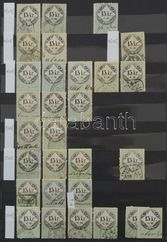 Description: Okmánybélyeg speciálgyűjtemény 1854 több mint 400 db okmánybélyeg címlet és fogazat szerint rendezve 8 lapos A4-es berakóban, köztük nagy címletű értékek is / Fiscal stamp specialised collection 1854 more than 400 fiscal stamps sorted by perforation and value in stockbook, including large values