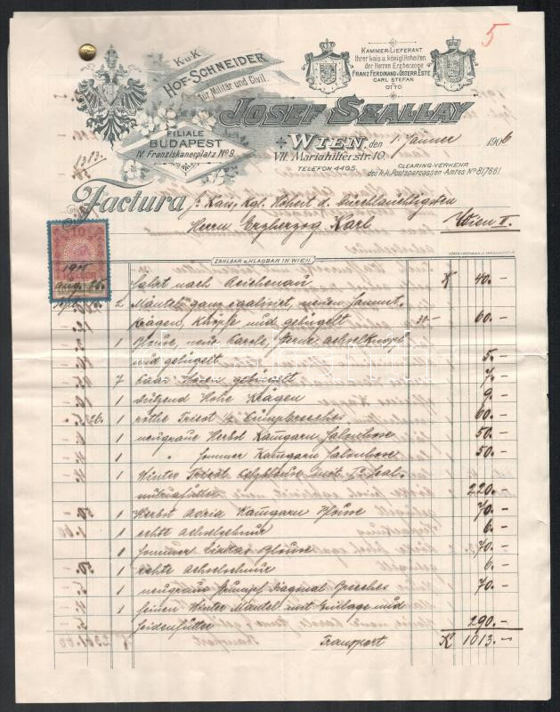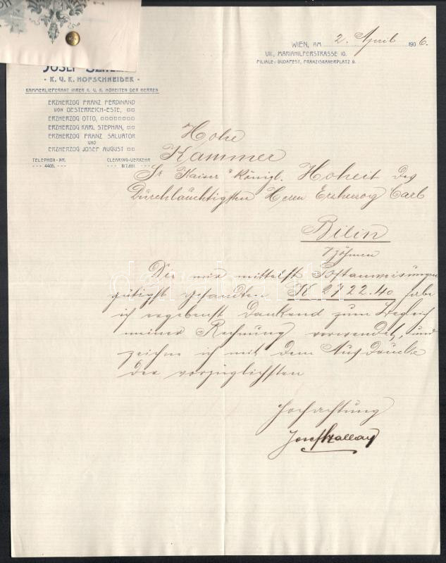 Description: 1906 Habsburg Károly, később IV. Károly részére szóló szabósági számla Joseph Szallay bécsi szabótól, hozzá autográf kísérő levele összesen 2722 Koronáról /
