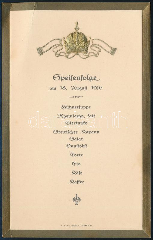 1916 Ferenc József császár 86. születésnapjára tartott díszvacsora men... https://www.darabanth.com/en/43-Major-auction/43.1/Historical-documents-manuscripts/Habsburg-related-items~17604/1916-Ferenc-Jozsef-csaszar-86-szuletesnapjara-tartott-diszvacsora-menukartyaja-Dombornyo~II3236882