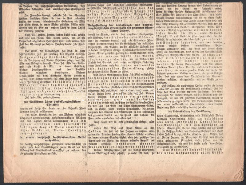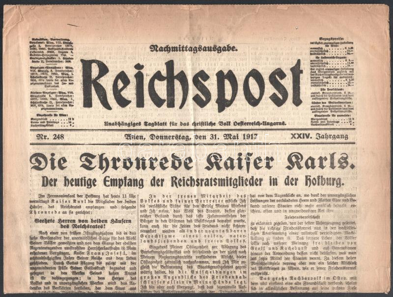 Description: 1917 I. Károly osztrák császár, magyar király trónbeszéde a Reichspost c. lap 1917. május 31. számának címlapján /