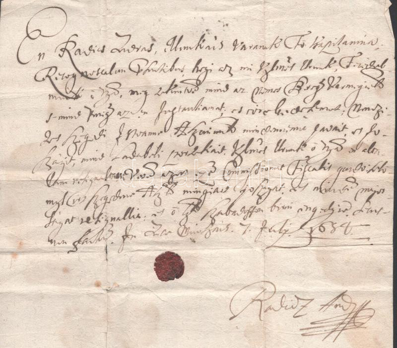 1684 Radics András (1640 körül-1711. február 13. után) köznemes, a kur... https://www.darabanth.com/en/43-Major-auction/43.1/Historical-documents-manuscripts/Historical-documents-manuscripts~17885/1684-Radics-Andras-1640-korul-1711-februar-13-utan-koznemes-a-kurucoknak-nevezett-bujdosC3~II3211545