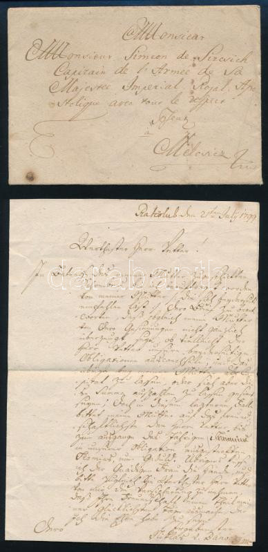 Description: 1799 Rakolub ("Vágrákó/Rakoluby), Bánóczy Miklós német nyelvű levele Sirchich Simon kapitányhoz Melesicz-re (Melcsic/Melcice), 1799. julius 21., borítékkal, rajta címeres töredezett viaszpecséttel, 1 beírt oldal