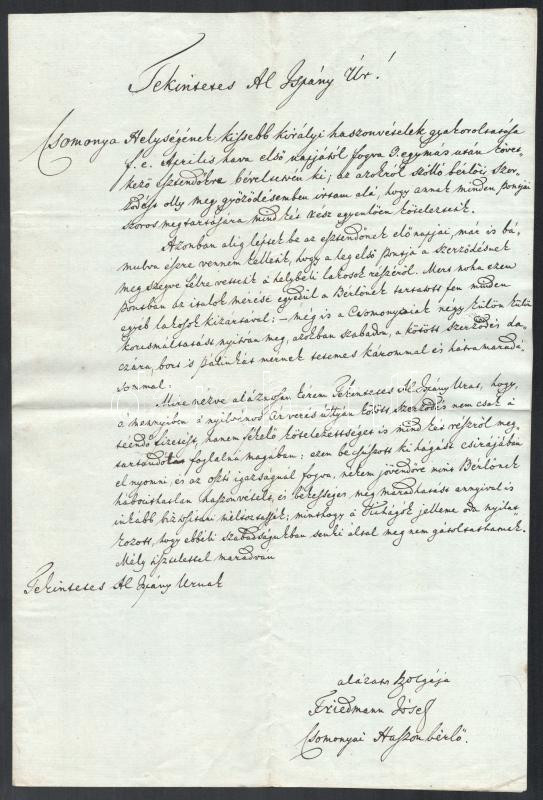 Description: 1840 Eötvös Tamás alispán, 1849-ben Munkács védője, főispán, képviselő saját kezű jegyzete és aláírása neki küldött levélen, tartalom: csomonyai (Csongor, Kárpátalja) haszonbérlő panasza, hogy rajta kívül mások is árusítanak italt