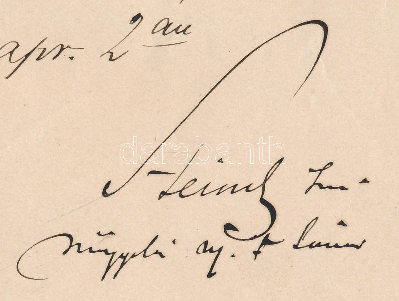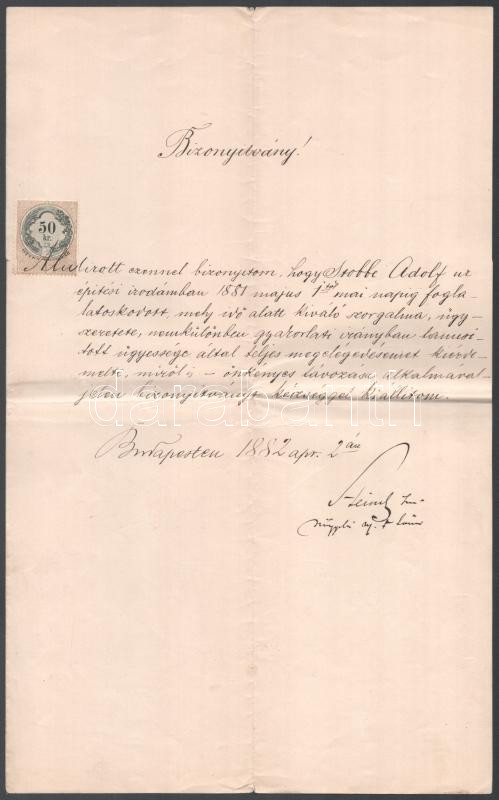1882 Steindl Imre (1839-1902.) építész, műegyetemi tanár, a magyar Országház tervezőjének autográf aláírása Stobbe Adolf építőmester, Stobbe Kálmán (1883-1936) építőmester, díszlettervező, labdarúgó, a magyar válogatott edzője édesapjának munkáltatói bizonyítványán, Bp., 1882. április 2., 50. és 15. kr. okmánybélyegekkel.