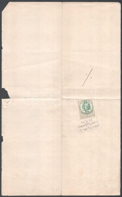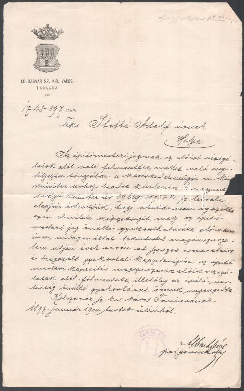 1897 Stobbe Adolf épÃtÅ‘mester, Stobbe Kálmán (1883-1936) épÃtÅ‘mester, dÃszlettervezÅ‘, labdarúgó, a magyar válogatott edzÅ‘je édesapjának épÃtÅ‘mesteri engedélye ("... az épÃtÅ‘ mesterség önálló gyakorlását önnek megengedte.") 15 kr okmánybélyeggel, pecséttel, "Kolozsvár Sz. Kir. Város Tanácsa" cÃmeres fejléces papÃron, Albach Géza (1829-1900) Kolozsvár polgármesterének (1886-1898) autográf aláÃrásával. A papÃr egyik szélén kis szakadással.