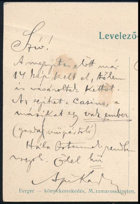Description: 1908 Kézdi-Kovács László (1864-1942) festőművész, műkritikus kiállítással kapcsolatos autográf sorai máramarosszigeti képeslapon: " A megnyitás előtt már 14 kép kelt el, tőlem is vásároltak kettőt. Az egyiket a Casino, a másikat egy vak ember (gazdag műpártoló) (...).