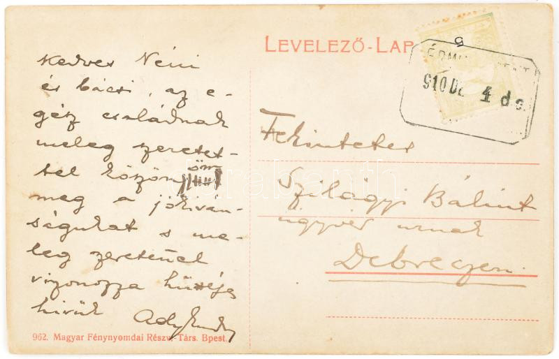 1910 Érdmindszent, Ady Endre (1877-1919): "Kedves Néni és bácsi, az egész családnak meleg szeretettel köszönöm meg a jókívánságukat s meleg szeretettel viszonozza hűséges hívük Ady Endre." Ady Endre autográf képeslapja, Szilágyi Bálint (1842-1918) debreceni ügyvéd, debreceni református presbiter, egyházi aljegyző, Debrecen sz. kir. város törvényhatósági bizottságának tagja, dr. Szilágyi Sándor budapesti állami főgimnáziumi tanár, klasszika-filológus édesapja részére, (utóbbi Kodály Zoltán Eötvös Collégiumi szobatársa.) Érdmindszereti képeslapon, postaügynökségi bélyegzéssel.
