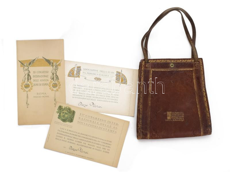 1911 Róma, XV. Congresso Internazionale delle Associazioni di Stampa, Olasz Bélyeggyűjtők Szövetségének XV. Nemzetközi Kongresszusának emlékei, belépőkártya, meghívók bankettre és fogadásra, programfüzet, emlékérem szalaggal, aranyozott, feliratozott bőr tarisznyában. Urai Dezső (1875-1966) író, színikritikus, szövegíró és operettszerző részére.