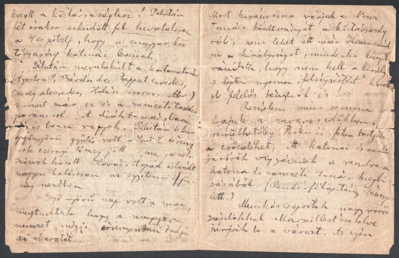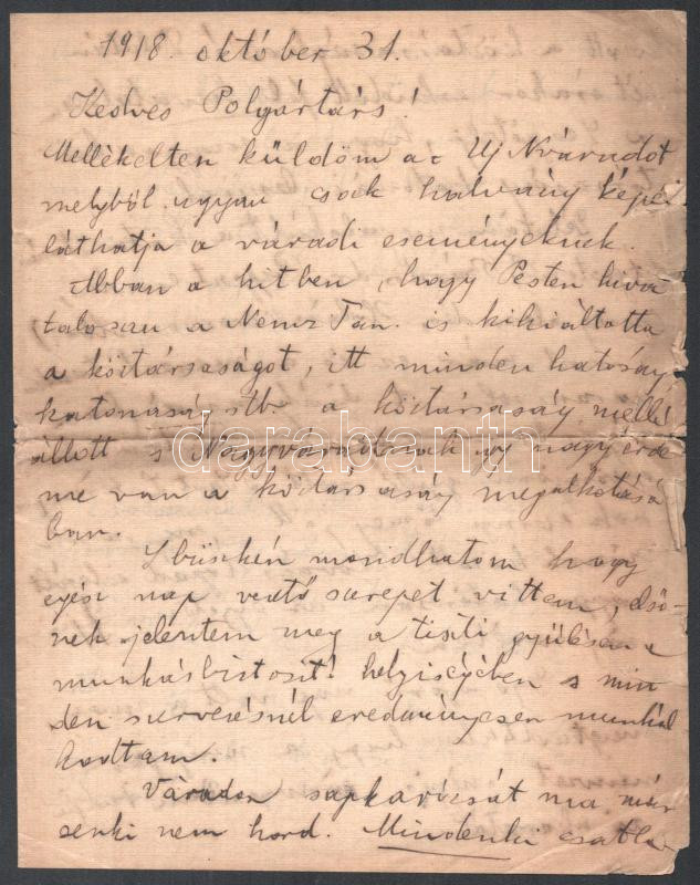 1918. október 31. Őszirózsás forradalom levéltudósítás a nagyváradi eseményekről, ismeretlen személy kézzel írt levele + újság