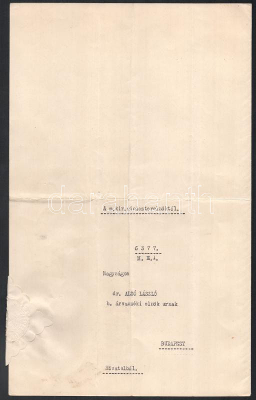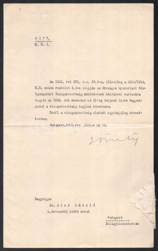 1935 Bp., vitéz jákfai Gömbös Gyula (1886-1936) tábornok, politikus, országgyűlési képviselő, volt honvédelmi miniszter, miniszterelnök (1932-1936) autográf aláírása kinevezési okiraton, hajtott, kissé sérült szárazbélyegzővel