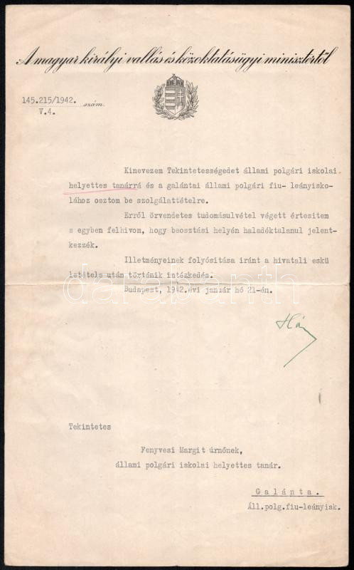 Description: 1942 Hóman Bálint (1885-1951) vallás- és közoktatásügyi miniszter aláírása egy galántai állami polgári iskolai tanári kinevezésen (Bárdossy-kormány, 1941. április 3. - 1942. március 9.), 1942. jan. 21., fejléces papíron, foltos.