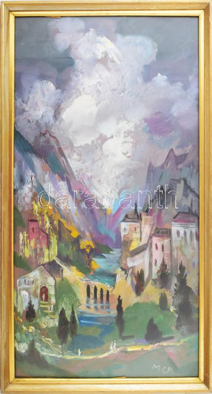 Molnár C. Pál (1894-1981): Toszkán táj zarándokokkal. Olaj, farost, jelzett, üvegezett fakeretben, 66×34 cm. / oil on wood fibre, signed, framed