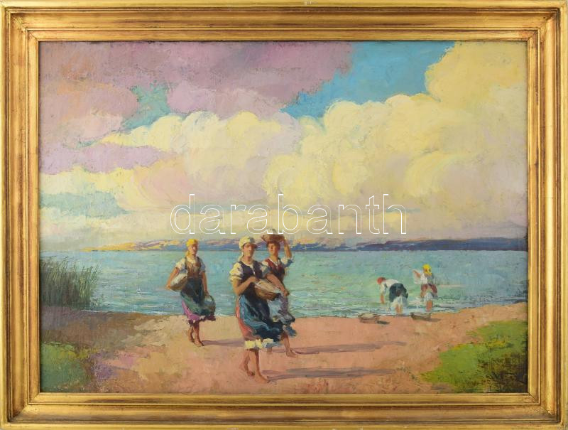 Ott Zoltán (1881-?): Nagymosás a Balaton partján. Olaj, vászon. Jelezv...