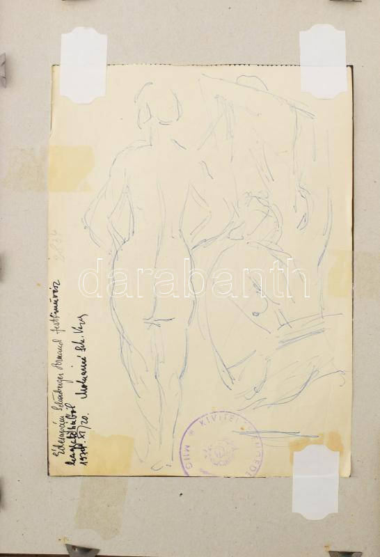 Schönberger Armand (1885-1974), kétoldalas mű: Vera alszik / Álló aktok. Vegyes technika, papír, jelzés nélkül. Hátoldalán a művész lánya, Molnárné Schönberger Vera igazolásával és régi MNG kiviteli bélyegzővel. Üvegezett fakeretben. 12X16,5 cm. / mixed technique on paper, unsigned, autograph lines by the painter1s daughter that it is an authentic work, framed