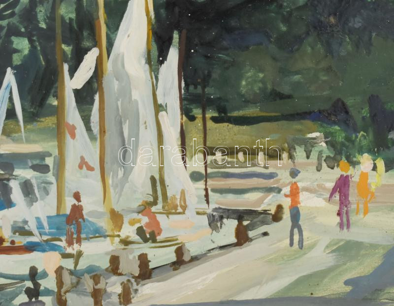 Duray Tibor (1912 - 1988): Vitorlások a kikötőben. Tempera, farost, je...