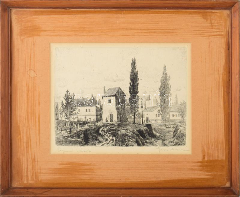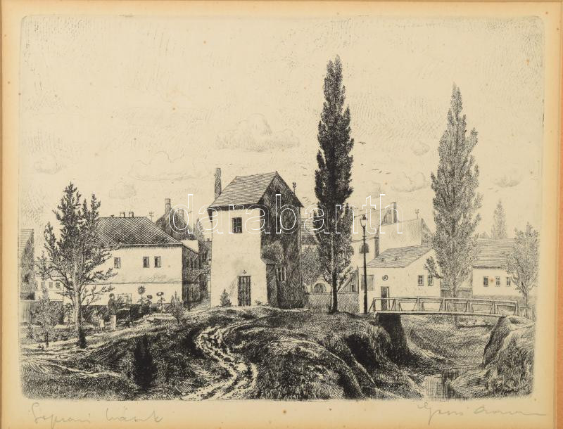 Description: Gross Arnold (1929-2015): Soproni házak. Rézkarc, papír. Jelzett. 22x29 cm. Lapon néhány egészen apró folttal. Fakeretben. / etching on paper, signed, framed, very slightly stained (few small spots)