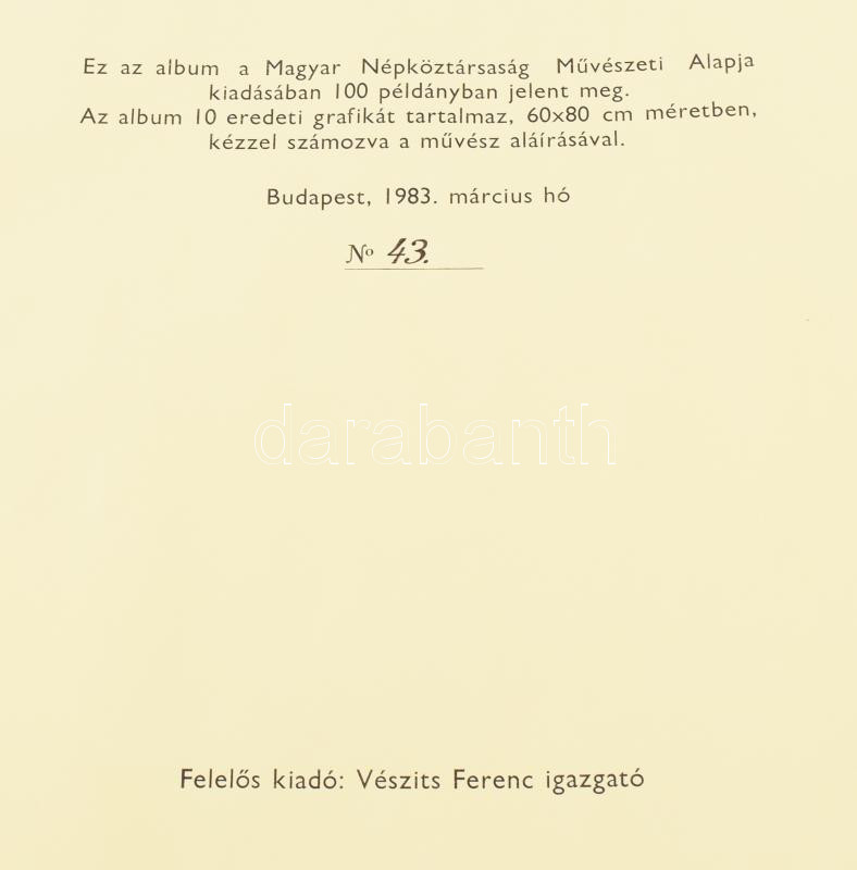 Szász Endre (1926-2003): Mappa 10 db grafikával, 1983. Szitanyomat, papÃr, egyenként jelzett, számozott (43/100), lapméret: 60×80 cm. Művészeti Alap kiadása. Kiadói vászon borÃtású, Szász Endre nevével feliratozott mappában, számozott fedlappal. Komplett, hiánytalan gyűjtÅ‘i darab! 3 lap szélén néhány kevés, egészen apró foltokkal, máskülönben jó állapotban.