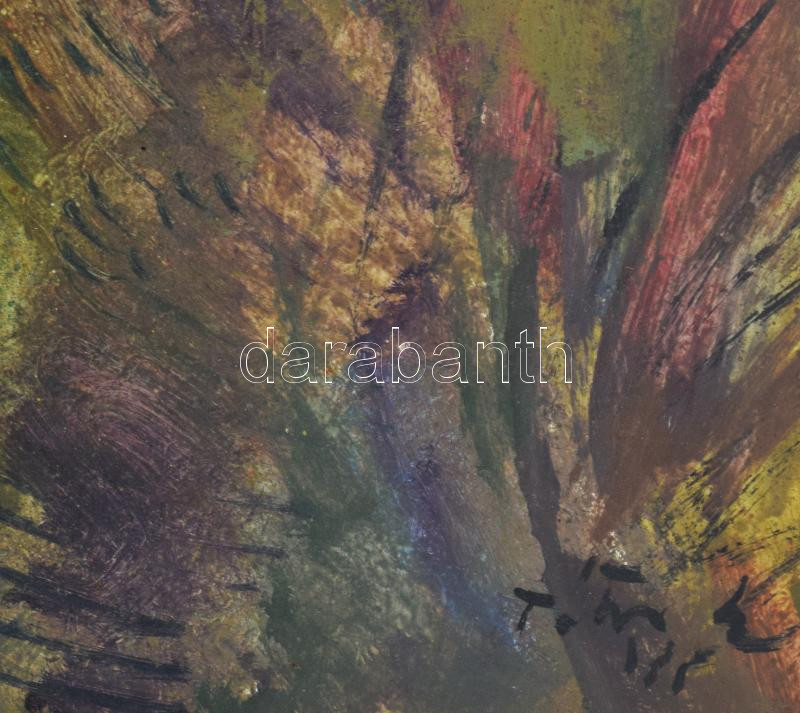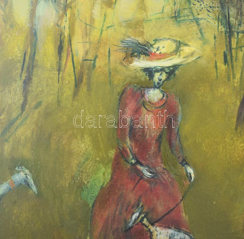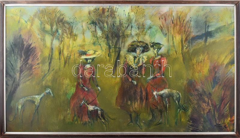 Description: Tóth Ernő (1949-): Szabadban (hölgyek kutyákkal), 1985. Olaj, farost. Jelzett. Hátoldalon Tóth Ernő autográf feliratával. Fakeretben. 53x93 cm / Ernő Tóth (1949-): Outdoors. Oil on wood fiber, signed. With autograph description on the reverse . Framed. 53x93 cm