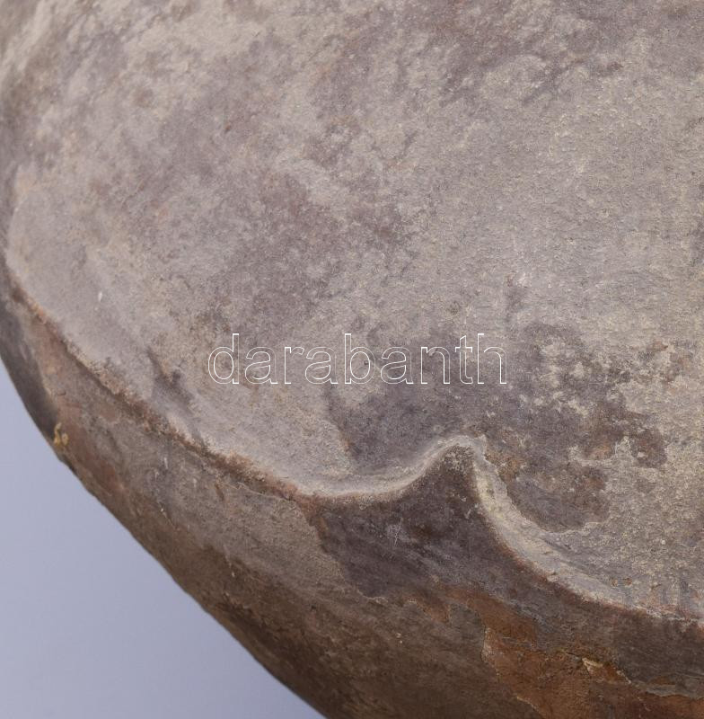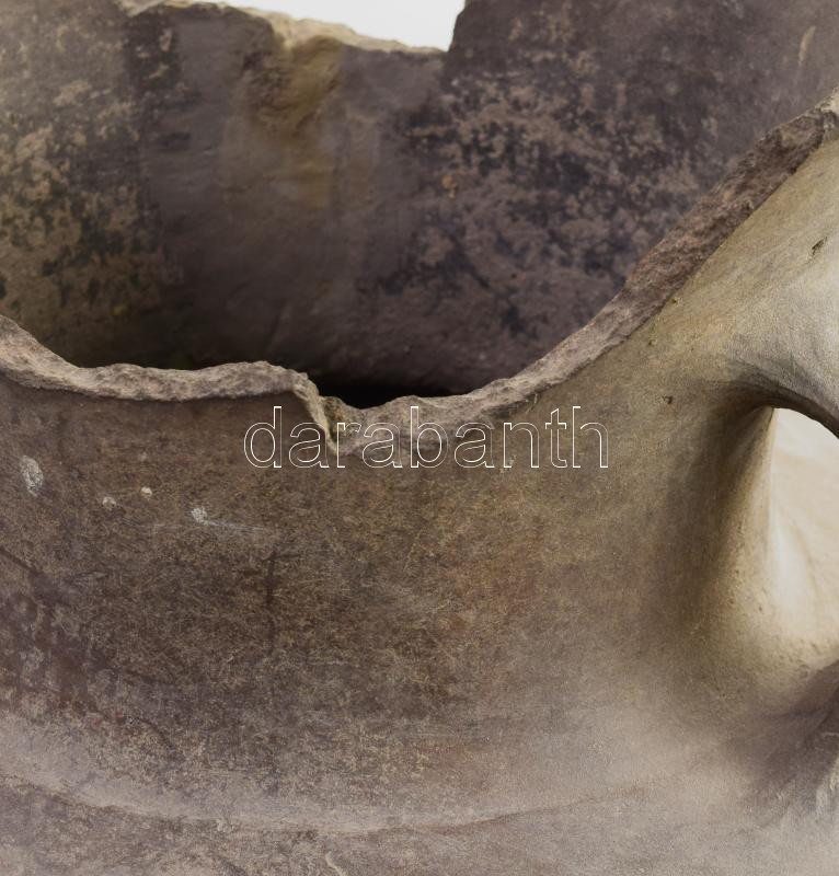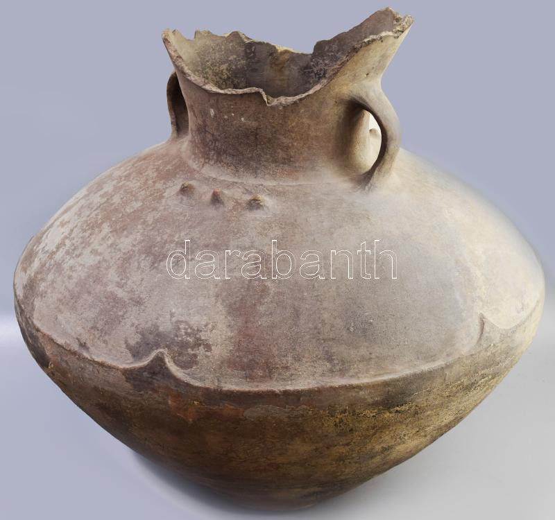Bronzkori hombár, két oldalán hárombütykös díszítéssel. Tisza vidéke, kerámia, hiányos, restaurált, d: 48 cm, m: 46 cm. Proveniencia: Jajczay János művészettörténész hagyatékából. KIZÁRÓLAG SZEMÉLYES ÁTVÉTEL, NEM POSTÁZZUK /// Bronze Age vessel with three-knobbed decoration on both sides. Tisza region, ceramic, incomplete, restored, diameter: 48 cm, height: 46 cm. Provenance: From the estate of art historian János Jajczay. /// ONLY PERSONAL COLLECTION, WE DO NOT SHIP / ONLY PERSONAL COLLECTION IN OUR OFFICE!