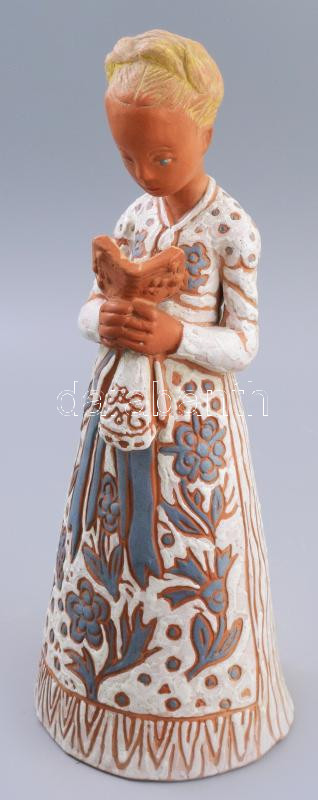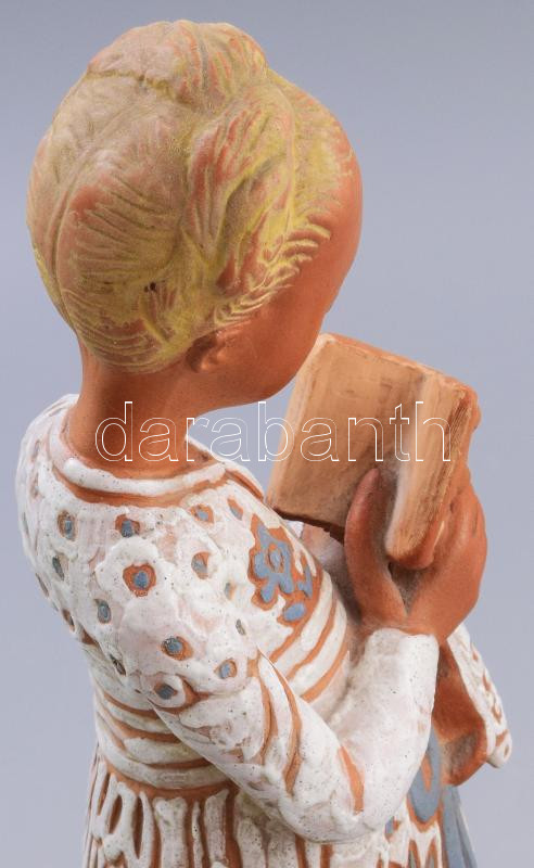Description: Kovács Margit (1902-1977): Olvasó lány. Zománccal és engóbbal festett terrakotta, jelzett a belsejében: MADE IN HUNGARY, illetve a kendőn: KM. M: 33 cm /// Margit Kovács (1902-1977): Reading Girl. Terracotta painted with enamel and engobe, signed inside: MADE IN HUNGARY, and on the scarf: KM. Height: 33 cm